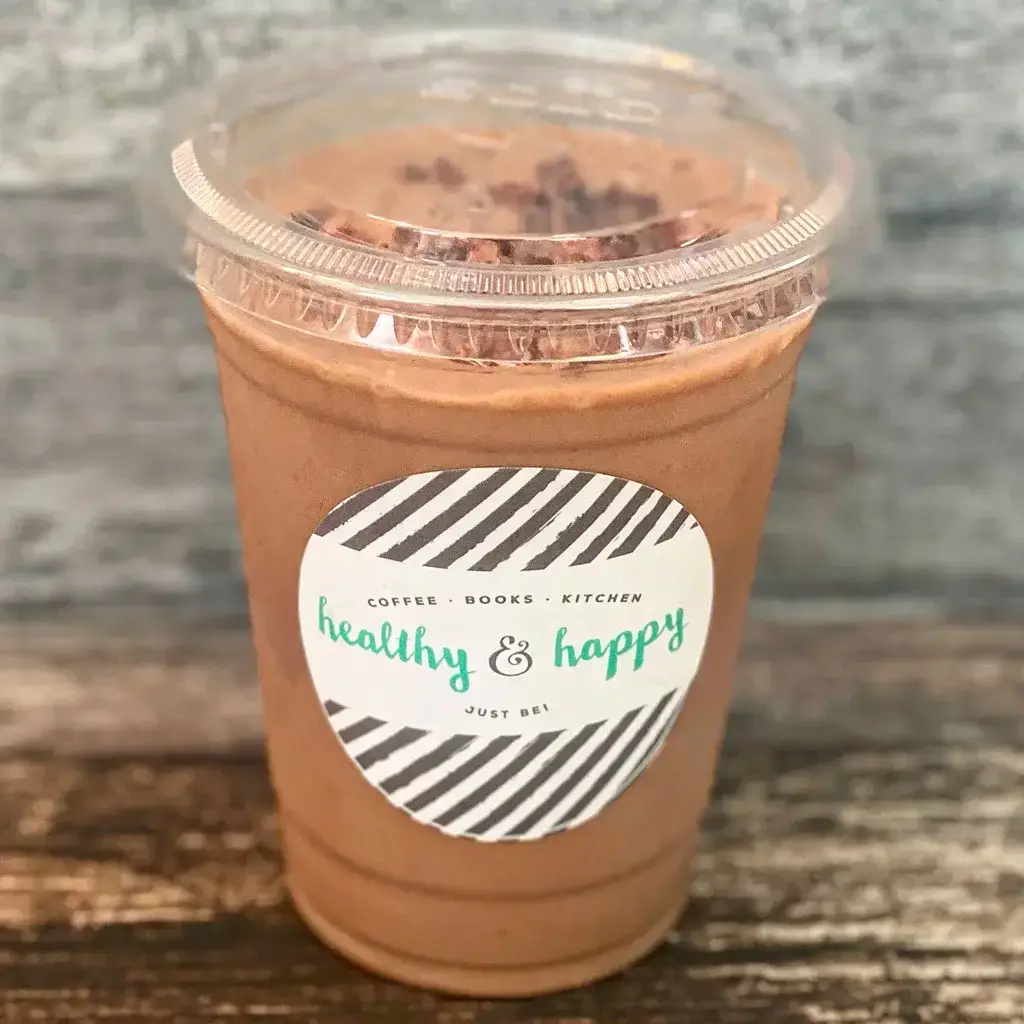 Espresso shot, oat milk, banana, almond butter & cacao nibs.