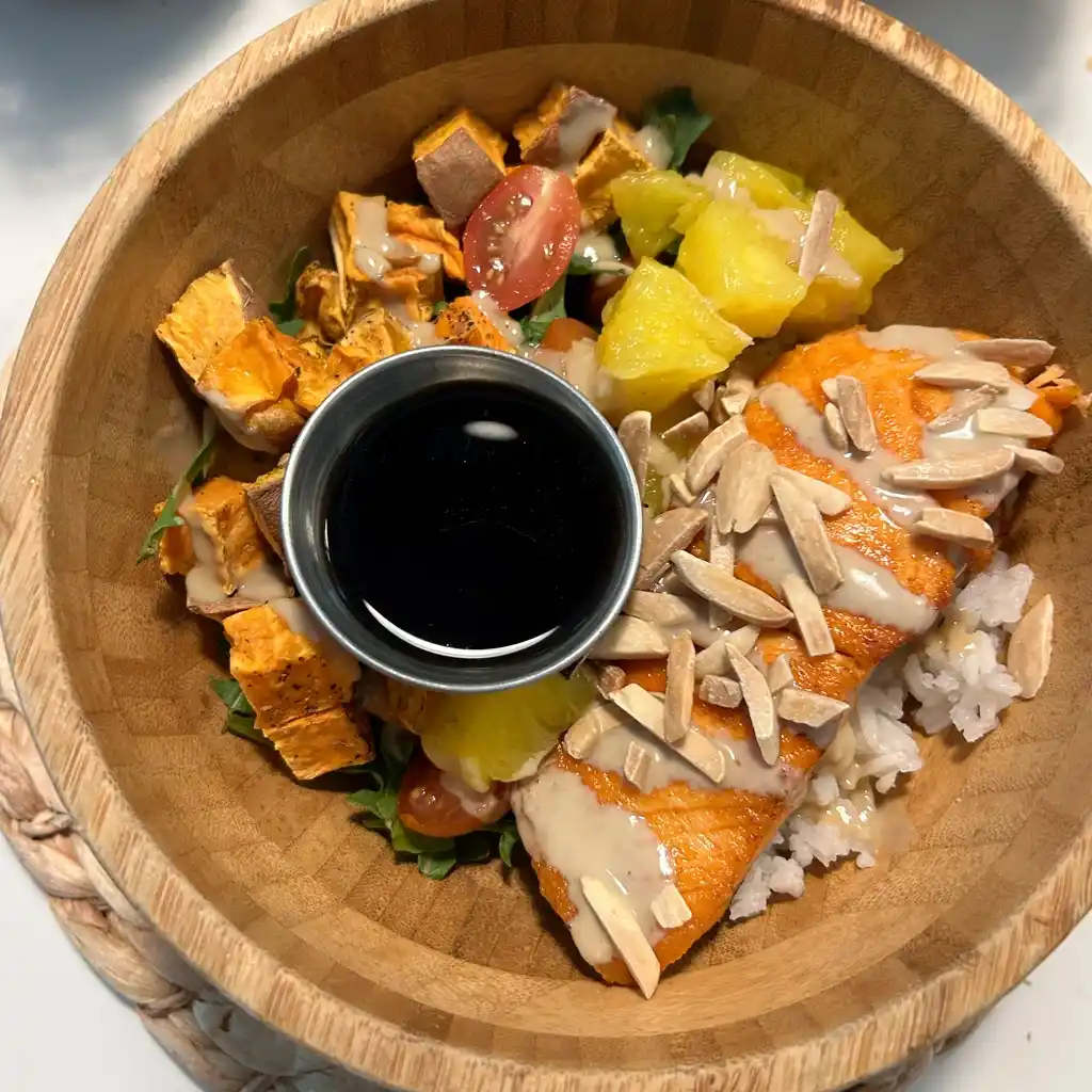 Wild caught salmon, jasmine rice, tahini sauce, almonds, sweet potato, cherry tomatoes, pineapple & ponzu on the side.